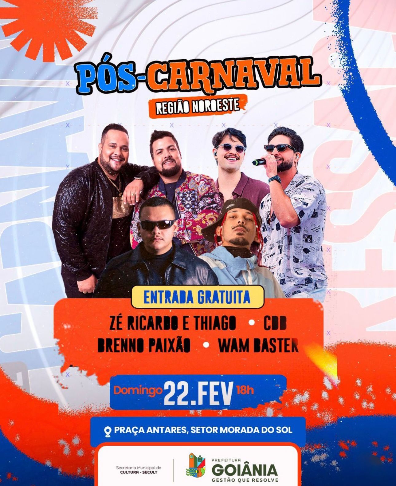 O prefeito Sandro Mabel anunciou, na noite desta sexta-feira (13/2), programação especial de pós-Carnaval em Goiânia. Entre as atrações confirmadas estão Jiraya Uai, Barões da Pisadinha, Zé Ricardo & Thiago,.