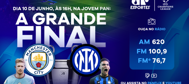 O Grupo Jovem Pan adquiriu os direitos de transmissão radiofônica da final da Liga dos Campeões e exibirá o embate entre Manchester City e Inter de Milão, marcado para começar às 16h (de Brasília) deste sábado, 10. A partir das 14h, a cobertura da Jovem Pan Esportes é iniciada no Panflix e no YouTube, com todo o pré-jogo. Às 15h30, a transmissão também passa pela rádio AM 620 e FM 100,9.